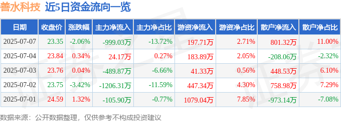 截至2025年7月7日收盘,善水科技(301190)报收于23.35元,下跌2.06%,换手率1.95%,成交量3.1万手,成交额7283.03万元。