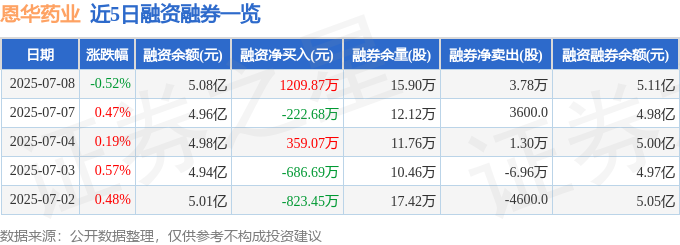 恩华药业融资融券信息显示,融资方面,当日融资买入2609.47万元,融资偿还1399.6万元,融资净买入1209.87万元。融券方面,融券卖出4.03万股,融券偿还2500.0股,融券余量15.9万股,融券余额337.08万元。融资融券余额5.11亿元。