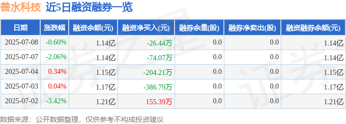 善水科技融资融券信息显示,融资方面,当日融资买入921.82万元,融资偿还948.26万元,融资净偿还26.44万元。融券方面,融券卖出0.0股,融券偿还0.0股,融券余量0.0股,融券余额0.0万元。融资融券余额1.14亿元。