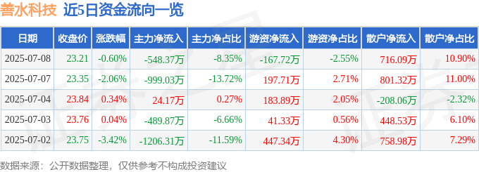 截至2025年7月8日收盘,善水科技(301190)报收于23.21元,下跌0.6%,换手率1.78%,成交量2.84万手,成交额6567.53万元。