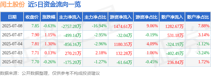 7月8日的资金流向数据方面,主力资金净流出2757.28万元,占总成交额16.94%,游资资金净流入1474.61万元,占总成交额9.06%,散户资金净流入1282.67万元,占总成交额7.88%。
