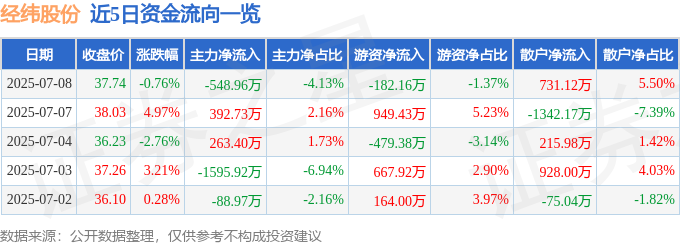 截至2025年7月8日收盘,经纬股份(301390)报收于37.74元,下跌0.76%,换手率12.08%,成交量3.51万手,成交额1.33亿元。