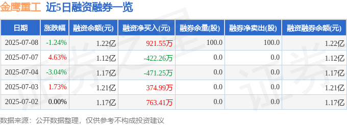 金鹰重工融资融券信息显示,融资方面,当日融资买入2348.08万元,融资偿还1426.53万元,融资净买入921.55万元。融券方面,融券卖出100.0股,融券偿还0.0股,融券余量100.0股,融券余额0.11万元。融资融券余额1.22亿元。
