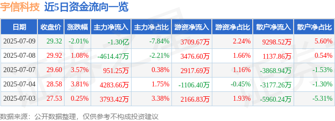 截至2025年7月9日收盘,宇信科技(300674)报收于29.32元,下跌2.01%,换手率8.03%,成交量56.46万手,成交额16.59亿元。