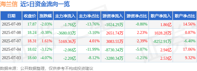 截至2025年7月9日收盘,海兰信(300065)报收于17.87元,下跌2.03%,换手率10.82%,成交量70.93万手,成交额12.8亿元。