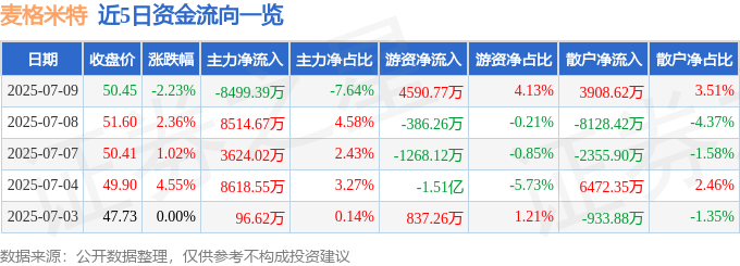 截至2025年7月9日收盘,麦格米特(002851)报收于50.45元,下跌2.23%,换手率4.8%,成交量21.85万手,成交额11.13亿元。