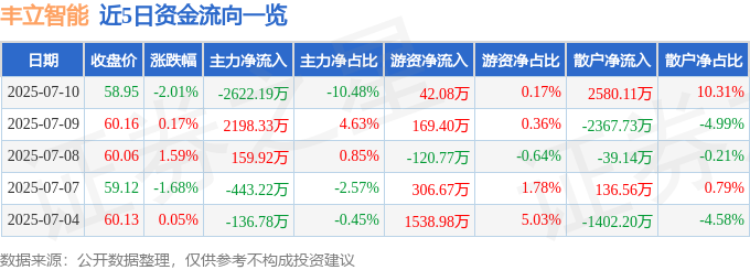 截至2025年7月10日收盘,丰立智能(301368)报收于58.95元,下跌2.01%,换手率6.6%,成交量4.24万手,成交额2.5亿元。