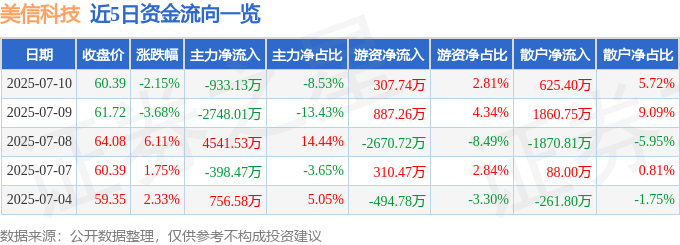截至2025年7月10日收盘,美信科技(301577)报收于60.39元,下跌2.15%,换手率9.59%,成交量1.81万手,成交额1.09亿元。