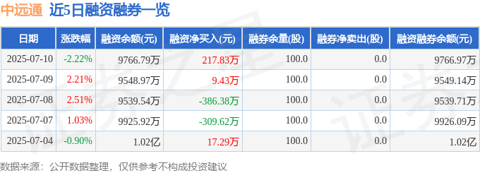 中远通融资融券信息显示,融资方面,当日融资买入1044.26万元,融资偿还826.43万元,融资净买入217.83万元。融券方面,融券卖出0.0股,融券偿还0.0股,融券余量100.0股,融券余额0.17万元。融资融券余额9766.97万元。