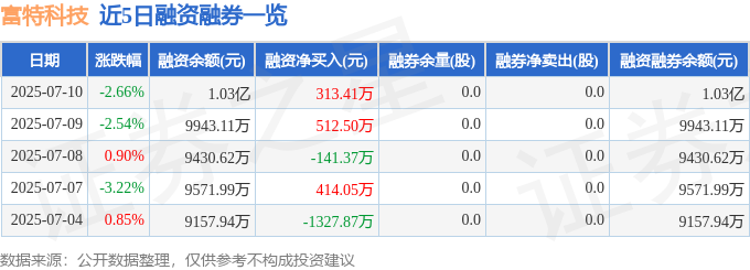 富特科技融资融券信息显示,融资方面,当日融资买入1609.43万元,融资偿还1296.03万元,融资净买入313.41万元。融券方面,融券卖出0.0股,融券偿还0.0股,融券余量0.0股,融券余额0.0万元。融资融券余额1.03亿元。