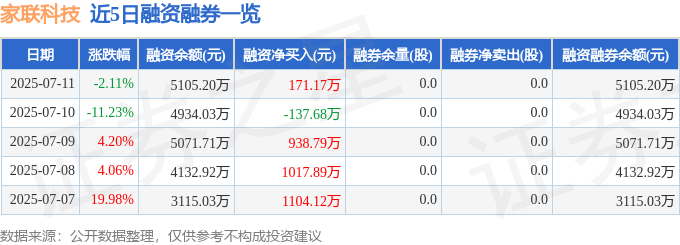 截至2025年7月11日收盘,家联科技(301193)报收于18.11元,下跌2.11%,换手率6.91%,成交量9.31万手,成交额1.7亿元。