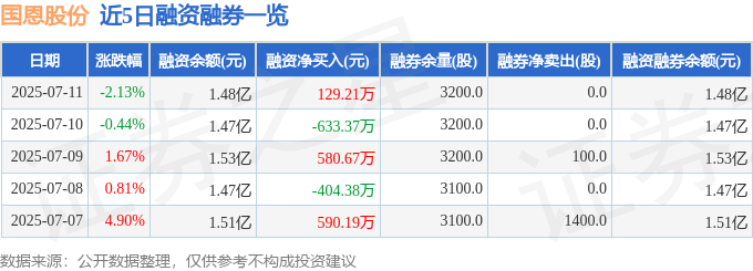 国恩股份融资融券信息显示,融资方面,当日融资买入1257.8万元,融资偿还1128.58万元,融资净买入129.21万元。融券方面,融券卖出0.0股,融券偿还0.0股,融券余量3200.0股,融券余额9.85万元。融资融券余额1.48亿元。