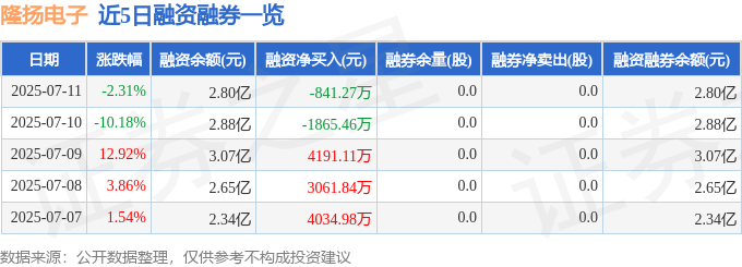 隆扬电子融资融券信息显示,融资方面,当日融资买入9159.7万元,融资偿还1.0亿元,融资净偿还841.27万元。融券方面,融券卖出0.0股,融券偿还0.0股,融券余量0.0股,融券余额0.0万元。融资融券余额2.8亿元。