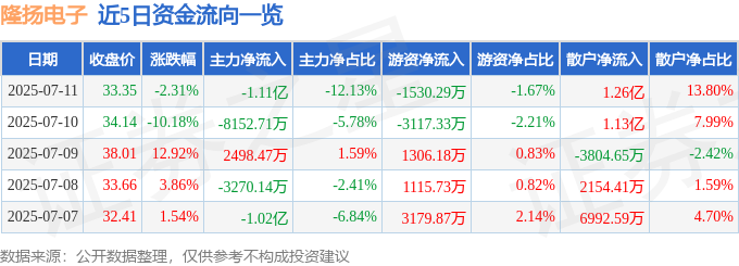 截至2025年7月11日收盘,隆扬电子(301389)报收于33.35元,下跌2.31%,换手率33.1%,成交量27.17万手,成交额9.16亿元。