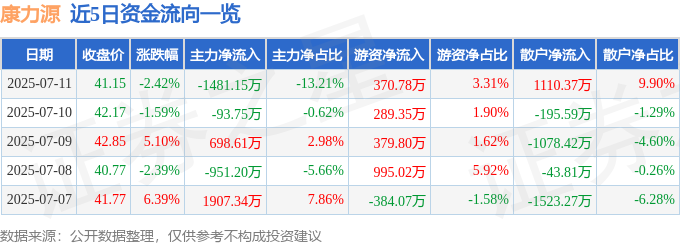 截至2025年7月11日收盘,康力源(301287)报收于41.15元,下跌2.42%,换手率16.01%,成交量2.73万手,成交额1.12亿元。