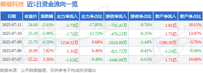 截至2025年7月11日收盘,德福科技(301511)报收于24.6元,下跌2.61%,换手率10.5%,成交量39.32万手,成交额9.71亿元。