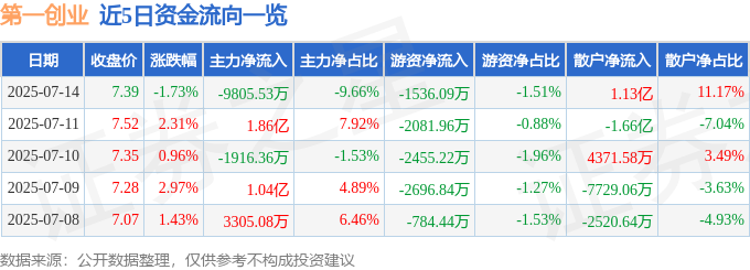 截至2025年7月14日收盘,第一创业(002797)报收于7.39元,下跌1.73%,换手率3.25%,成交量136.52万手,成交额10.15亿元。