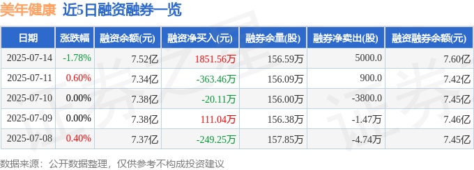 美年健康融资融券信息显示,融资方面,当日融资买入3259.2万元,融资偿还1407.64万元,融资净买入1851.56万元。融券方面,融券卖出5600.0股,融券偿还600.0股,融券余量156.59万股,融券余额778.25万元。融资融券余额7.6亿元。