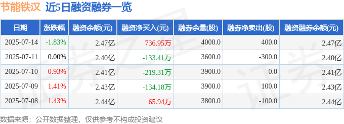 节能铁汉融资融券信息显示,融资方面,当日融资买入1494.08万元,融资偿还757.14万元,融资净买入736.95万元。融券方面,融券卖出400.0股,融券偿还0.0股,融券余量4000.0股,融券余额0.86万元。融资融券余额2.47亿元。
