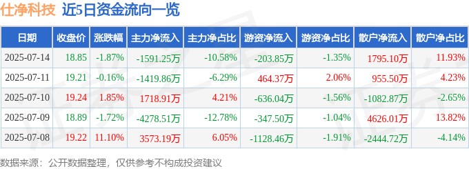 截至2025年7月14日收盘,仕净科技(301030)报收于18.85元,下跌1.87%,换手率4.94%,成交量7.98万手,成交额1.5亿元。