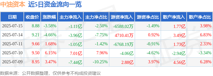 截至2025年7月15日收盘,中油资本(000617)报收于8.88元,下跌3.58%,换手率3.86%,成交量488.1万手,成交额44.35亿元。