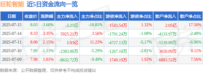 截至2025年7月15日收盘,巨轮智能(002031)报收于8.03元,下跌3.6%,换手率7.36%,成交量145.87万手,成交额11.73亿元。