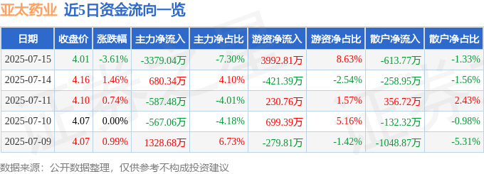 截至2025年7月15日收盘,亚太药业(002370)报收于4.01元,下跌3.61%,换手率15.36%,成交量114.56万手,成交额4.63亿元。