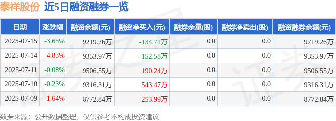 泰祥股份融资融券信息显示,融资方面,当日融资买入378.22万元,融资偿还512.93万元,融资净偿还134.71万元。融券方面,融券卖出0.0股,融券偿还0.0股,融券余量0.0股,融券余额0.0万元。融资融券余额9219.26万元。