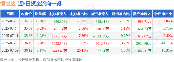 截至2025年7月15日收盘,恒铭达(002947)报收于34.37元,下跌3.7%,换手率7.11%,成交量13.68万手,成交额4.7亿元。