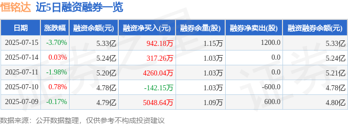 恒铭达融资融券信息显示,融资方面,当日融资买入6730.64万元,融资偿还5788.46万元,融资净买入942.18万元,连续3日净买入累计5519.47万元。融券方面,融券卖出1200.0股,融券偿还0.0股,融券余量1.15万股,融券余额39.53万元。融资融券余额5.33亿元。