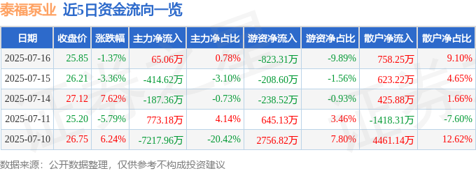 截至2025年7月16日收盘,泰福泵业(300992)报收于25.85元,下跌1.37%,换手率4.15%,成交量3.21万手,成交额8327.92万元。