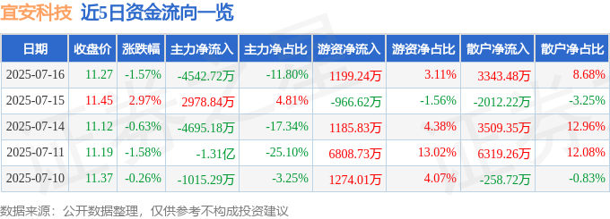 7月16日的资金流向数据方面,主力资金净流出4542.72万元,占总成交额11.8%,游资资金净流入1199.24万元,占总成交额3.11%,散户资金净流入3343.48万元,占总成交额8.68%。