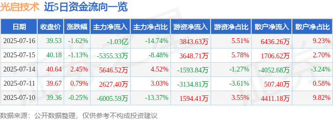 7月16日的资金流向数据方面,主力资金净流出1.03亿元,占总成交额14.74%,游资资金净流入3843.63万元,占总成交额5.51%,散户资金净流入6436.26万元,占总成交额9.23%。