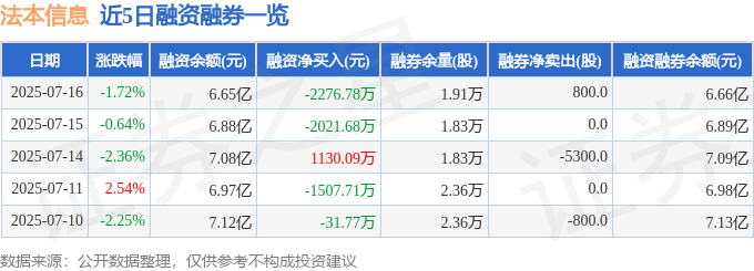 法本信息融资融券信息显示,融资方面,当日融资买入6025.27万元,融资偿还8302.05万元,融资净偿还2276.78万元。融券方面,融券卖出800.0股,融券偿还0.0股,融券余量1.91万股,融券余额46.99万元。融资融券余额6.66亿元。