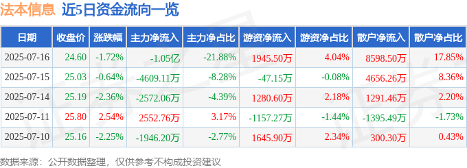 截至2025年7月16日收盘,法本信息(300925)报收于24.6元,下跌1.72%,换手率5.89%,成交量19.46万手,成交额4.82亿元。