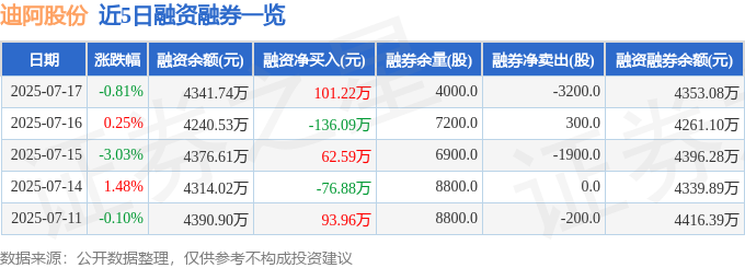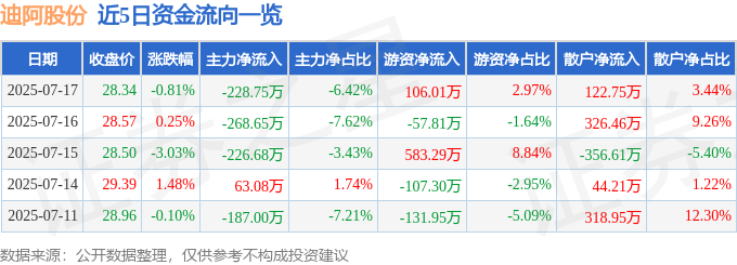 截至2025年7月17日收盘,迪阿股份(301177)报收于28.34元,下跌0.81%,换手率0.31%,成交量1.26万手,成交额3564.26万元。
