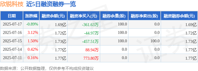 欣锐科技融资融券信息显示,融资方面,当日融资买入1056.16万元,融资偿还1417.78万元,融资净偿还361.63万元。融券方面,融券卖出0.0股,融券偿还0.0股,融券余量100.0股,融券余额0.2万元。融资融券余额1.69亿元。