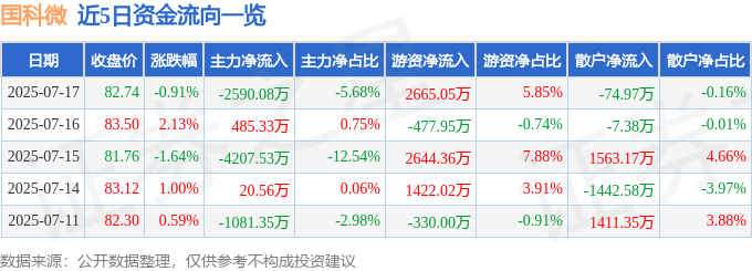 截至2025年7月17日收盘,国科微(300672)报收于82.74元,下跌0.91%,换手率2.64%,成交量5.54万手,成交额4.56亿元。
