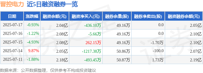 晋控电力融资融券信息显示,融资方面,当日融资买入2210.53万元,融资偿还2646.63万元,融资净偿还436.1万元。融券方面,融券卖出0.0股,融券偿还0.0股,融券余量49.16万股,融券余额157.8万元。融资融券余额2.05亿元。
