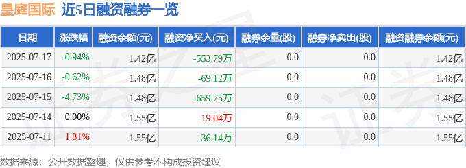 皇庭国际融资融券信息显示,融资方面,当日融资买入579.92万元,融资偿还1133.7万元,融资净偿还553.79万元。融券方面,融券卖出0.0股,融券偿还0.0股,融券余量0.0股,融券余额0.0万元。融资融券余额1.42亿元。
