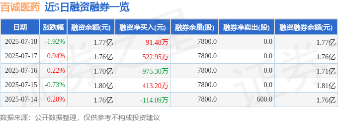 百诚医药融资融券信息显示,融资方面,当日融资买入1544.67万元,融资偿还1453.19万元,融资净买入91.48万元。融券方面,融券卖出0.0股,融券偿还0.0股,融券余量7800.0股,融券余额37.94万元。融资融券余额1.77亿元。