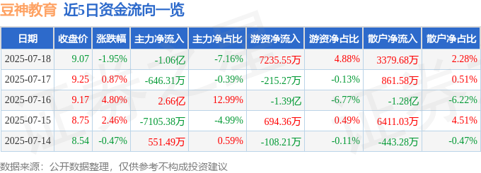 截至2025年7月18日收盘,豆神教育(300010)报收于9.07元,下跌1.95%,换手率9.61%,成交量159.77万手,成交额14.83亿元。