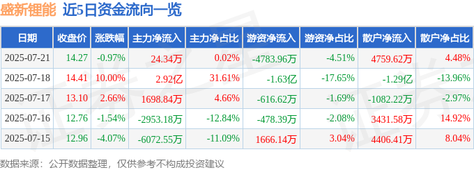 截至2025年7月21日收盘,盛新锂能(002240)报收于14.27元,下跌0.97%,换手率8.6%,成交量74.48万手,成交额10.61亿元。