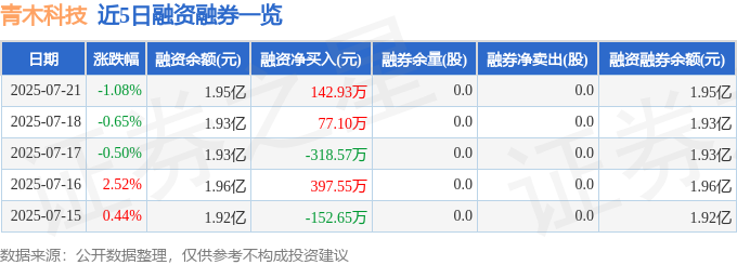 青木科技融资融券信息显示,融资方面,当日融资买入1293.01万元,融资偿还1150.09万元,融资净买入142.93万元。融券方面,融券卖出0.0股,融券偿还0.0股,融券余量0.0股,融券余额0.0万元。融资融券余额1.95亿元。