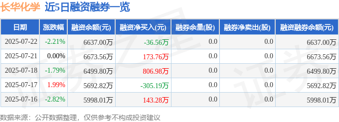 长华化学融资融券信息显示,融资方面,当日融资买入1108.36万元,融资偿还1144.92万元,融资净偿还36.56万元。融券方面,融券卖出0.0股,融券偿还0.0股,融券余量0.0股,融券余额0.0万元。融资融券余额6637.0万元。