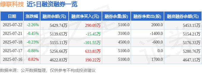 绿联科技融资融券信息显示,融资方面,当日融资买入722.89万元,融资偿还432.81万元,融资净买入290.09万元。融券方面,融券卖出2000.0股,融券偿还0.0股,融券余量5100.0股,融券余额23.4万元。融资融券余额5453.15万元。