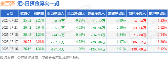 截至2025年7月22日收盘,金百泽(301041)报收于25.82元,下跌2.27%,换手率5.52%,成交量4.36万手,成交额1.14亿元。