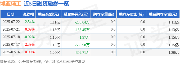 博亚精工融资融券信息显示,融资方面,当日融资买入1200.3万元,融资偿还1438.34万元,融资净偿还238.04万元。融券方面,融券卖出0.0股,融券偿还0.0股,融券余量0.0股,融券余额0.0万元。融资融券余额1.11亿元。