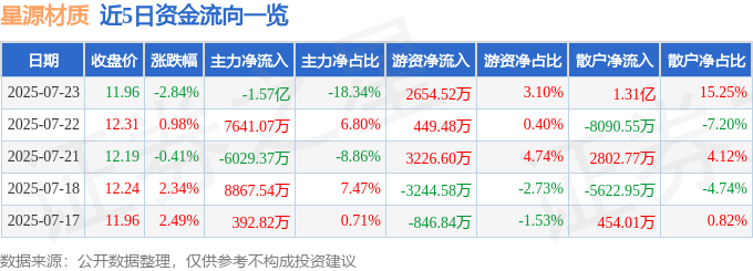 截至2025年7月23日收盘,星源材质(300568)报收于11.96元,下跌2.84%,换手率5.87%,成交量71.2万手,成交额8.57亿元。