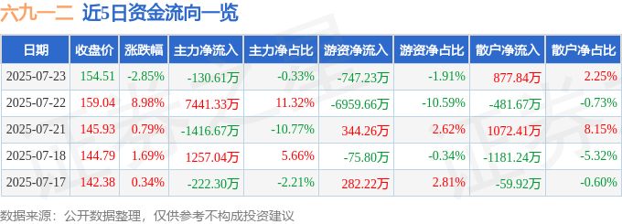 截至2025年7月23日收盘,六九一二(301592)报收于154.51元,下跌2.85%,换手率14.45%,成交量2.53万手,成交额3.91亿元。